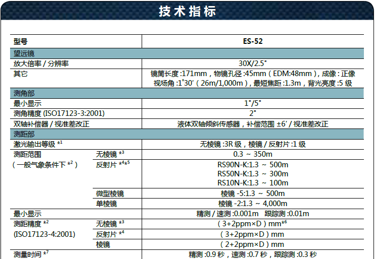 ● ES-52 所具有的編碼器能夠保證在持續(xù)測(cè)量條件下角度的可靠性。雙軸補(bǔ)償器能夠保證儀器在地形惡劣的環(huán)境下仍精確水平